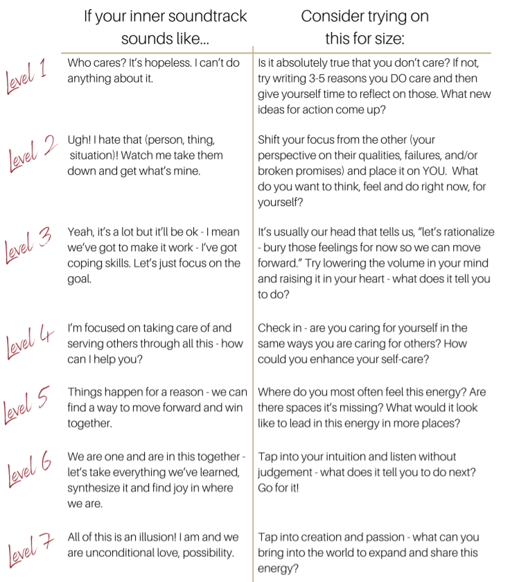 Regardless of your choice, here is a glimpse at the levels and an exercise to consider for each to help you grow awareness and shift your energy if you are so inclined!